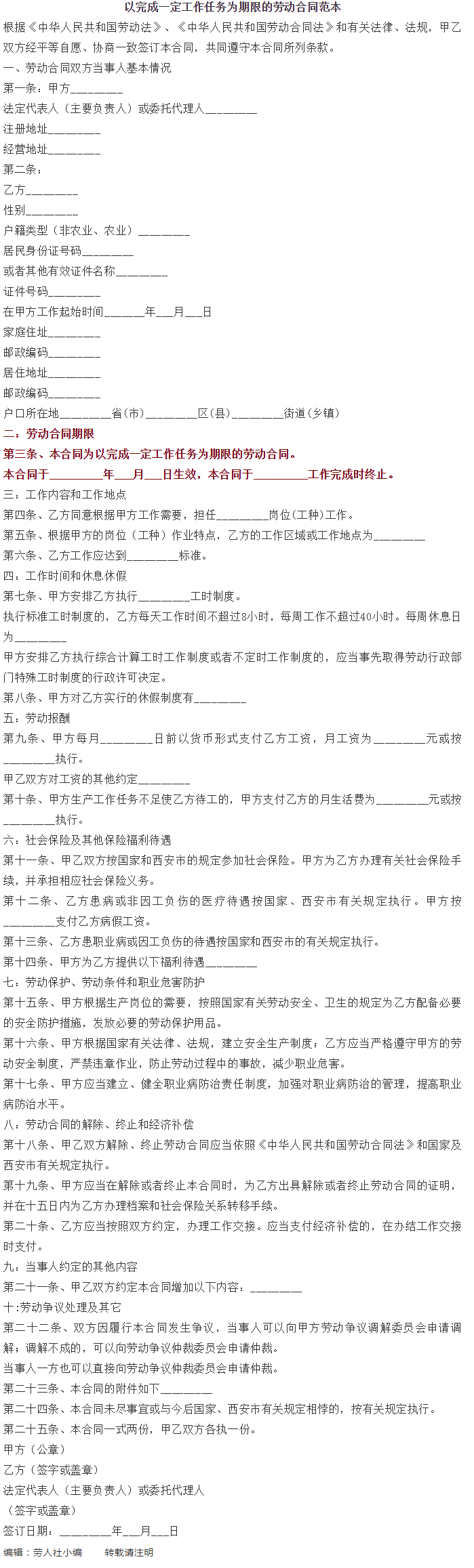 以完成一定工作任务为期限的劳动合同范本