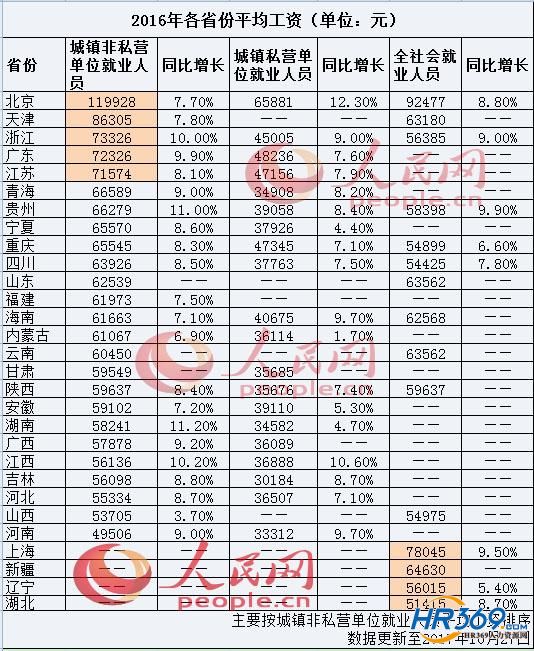 国家统计局发布的数据显示,2016年全国城镇非私营单位就业人员年平均工资67569元,同比名义增长8.9%;全国城镇私营单位就业人员年平均工资42833元,同比名义增长8.2%。