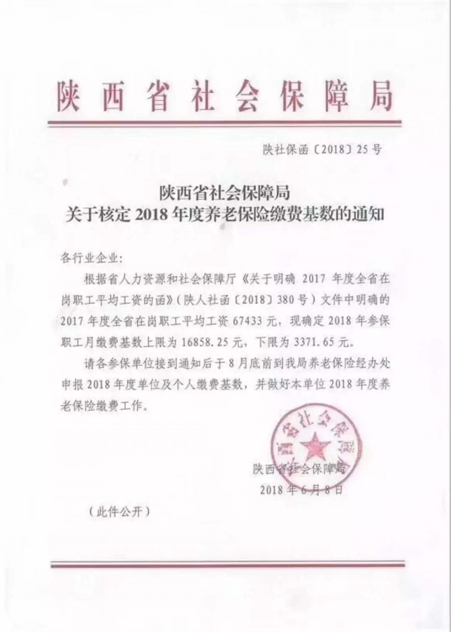 陕西省社会保障局关于核定2018年度养老保险缴费基数的通知