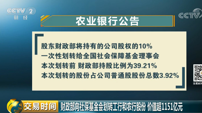 中国农业银行和工商银行在昨天晚间发布公告称,两家公司都收到通知,股东财政部将其持有的公司股权的10%一次性划转给全国社会保障基金理事会持有。 财政部向社保基金会划转工行和农行股权 价值超1151亿元