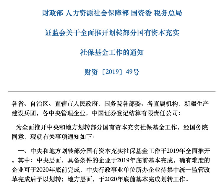 对此,财经评论员王超进行了解读,他表示,此次大动作是落实了财政部、人社部、国资委、税务总局和证监会在9月20日发布的《关于全面推开划转部分国有资本充实社保基金工作的通知》文件精神。 他认为,国资划转渠道打开,缓解了三大难题:①有利于社保缺口弥补;②混改后央企工作效率会提高;③会给民营企业带来更好的竞争机会和营商环境。 为啥要将国资划转社保为什么会有这样的动作? 事情要从2017年说起,当年年底,国务院印发《划转部分国有资本充实社保基金实施方案》。《方案》称,为充分体现代际公平和国有企业发展成果全民共享,现决定划转部分国有资本充实社保基金。 其中,规定将中央和地方国有及国有控股大中型企业、金融机构纳入划转范围。划转比例统一为企业国有股权的10%。 《方案》提出,划转的中央企业国有股权,由国务院委托社保基金会负责集中持有,单独核算,接受考核和监督。 社保基金会等承接主体作为财务投资者,享有所划入国有股权的收益权和处置权,社保基金会等承接主体的收益主要来源于股权分红。对划入的国有股权,原则上应履行3年以上的禁售期义务。 到了2019年7月,国常会决定,今年全面推开将中央和地方国有及国有控股大中型企业和金融机构的10%国有股权,划转至社保基金会和地方相关承接主体,并作为财务投资者,依照规定享有收益权等权利。 9月20日,财政部、人力资源社会保障部、国资委、税务总局、证监会发布《关于全面推开划转部分国有资本充实社保基金工作的通知》。