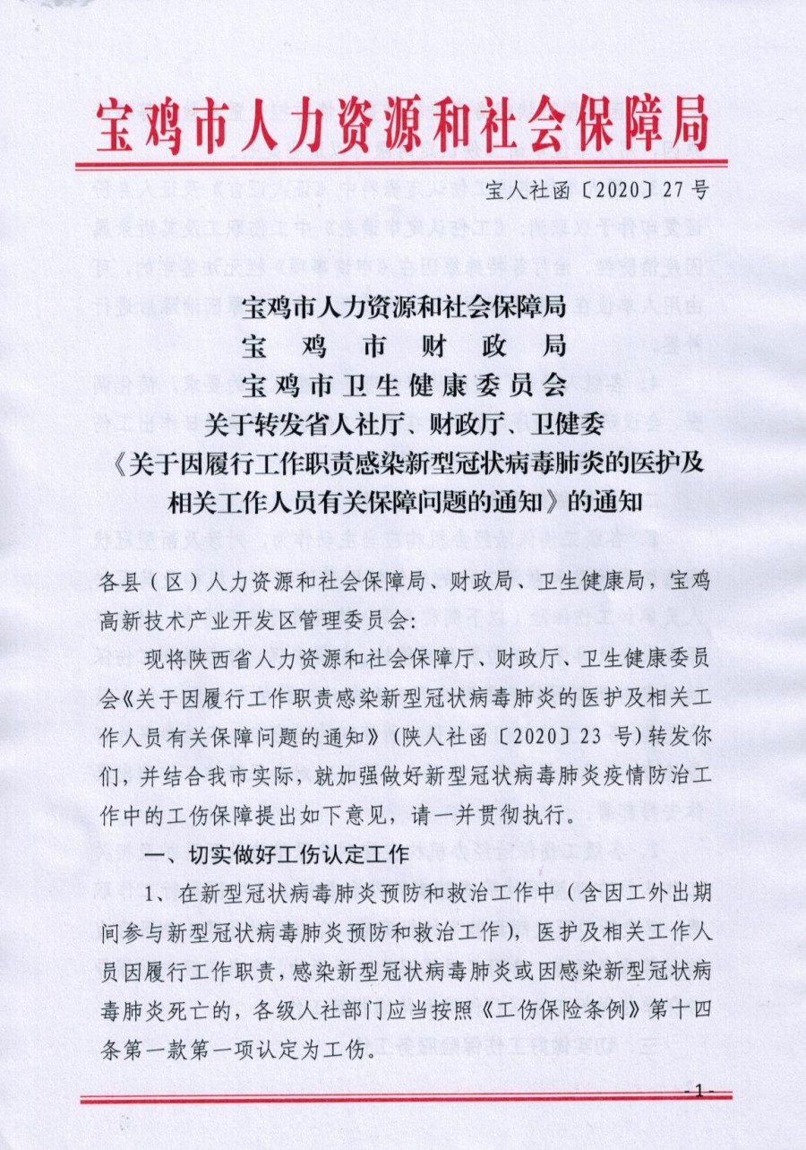 省人社厅、财政厅、卫健委《关于因履行工作职责感染新型冠状病毒肺炎的医护及相关工作人员有关保障问题的通知》