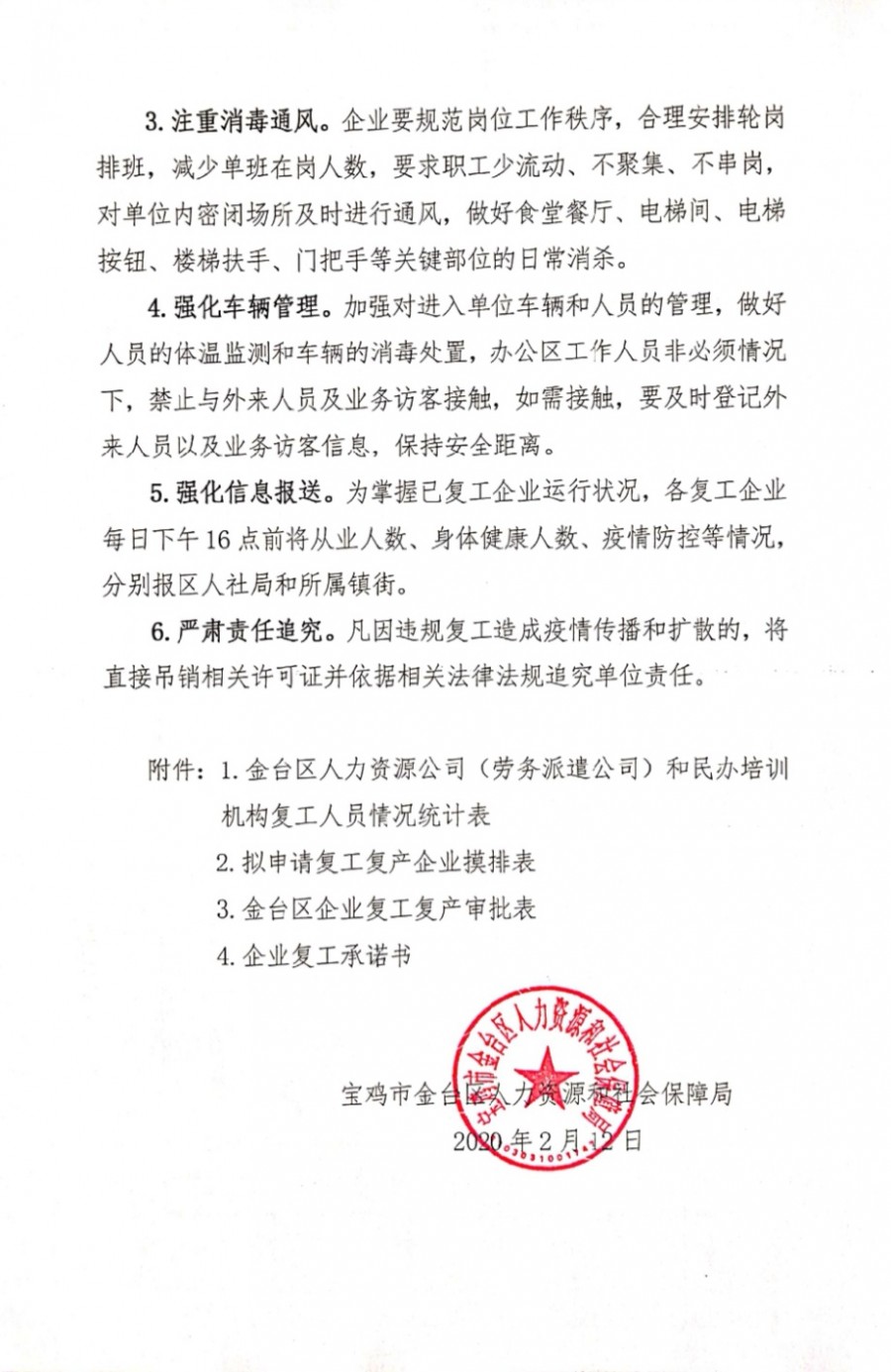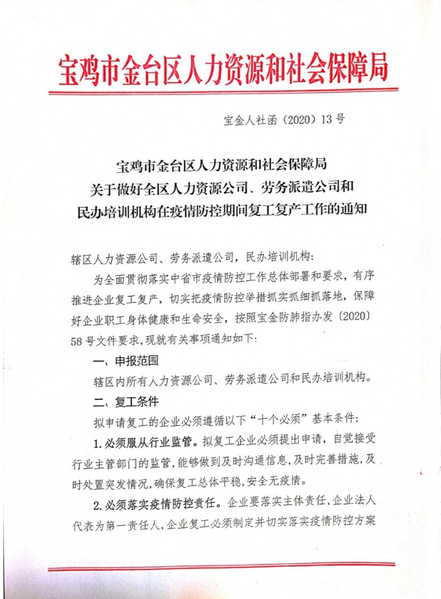 宝鸡市金台区人力资源和社会保障局关于做好全区人力资源公司,劳务派遣公司和民办培训机构在疫情防控期间复工复产工作的通知