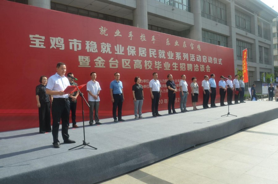 7月27日,宝鸡市人社局举办2020年稳就业保居民就业系列活动启动仪式暨金台区高校毕业生招聘洽谈会。此次活动以“就业手拉手•乐业在宝鸡”为主题,计划利用三个月时间,开展“助力脱贫”精准就业帮扶、“千企万岗”线上线下招聘、“青春奋斗”高校毕业生就业促进活动、“素质提升”职业技能培训、“铺路助创”扶持创业创新以及“惠民援企”政策服务落地等一系列活动,在全市范围内掀起就业创业新热潮。