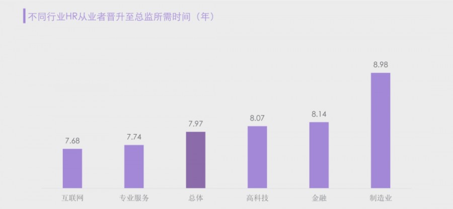 行业因素:行业成熟度越高晋升越难 HR从业者平均晋升至总监的时间为7.97年。 从主要研究的五个行业来看,互联网行业和专业服务行业晋升至总监所需时间较短,低于总体的所需时间。而在制造业中,HR晋升至总监所需时长最长,需要近9年的时间。因此可以看出,行业成熟度越高,晋升至总监所需的时长越长。