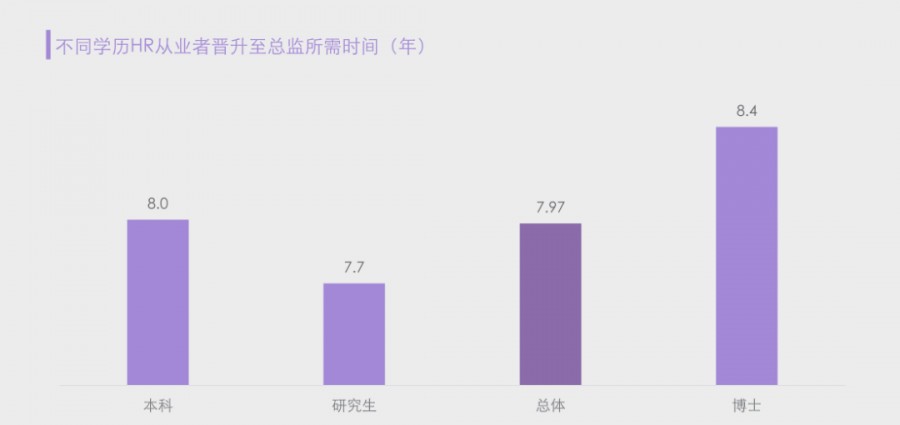 教育因素:HR专业更有晋升优势 学历对比: 根据此次数据得出:研究生学历从业者晋升至总监所需时间最短为7.7年,相对晋升时长最长的为博士学历,平均需要8.4年才能晋升到总监级别。并非学历越高晋升时长越短,研究生学历从业者在晋升方面最具优势。
