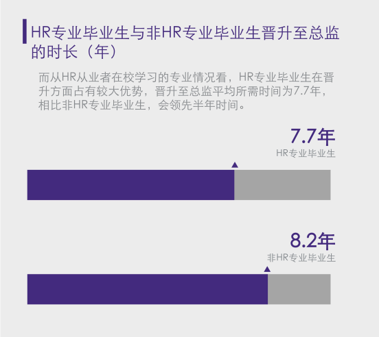 专业对比: 根据参与调研的毕业专业来看,HR专业毕业生在晋升方面占有较大优势,晋升至总监平均所需时间为7.7年, 相比非HR专业毕业生,会领先半年时间。