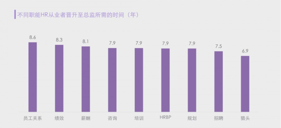 职能因素:猎头招聘相比晋升更快 不同职能的从业者在晋升方面也有着较大的区别,最大时间差高达1.7年。 人力资源服务类职能,晋升至总监相对较快,猎头职能的从业者平均晋升至总监仅需6.9年。而招聘类工作的从业者晋升至总监也比 HR平均晋升时长短。而晋升时长相对较长的职能分别为员工关系、绩效和薪酬,平均晋升至总监时长均超过8年。
