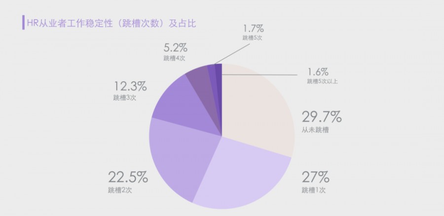 工作稳定性:29.7%HR从业者未跳过槽 HR行业从业者工作稳定性较强,至今为止,未跳槽的从业者占比29.7%。 换过一家单位的HR从业者占比27%。换过两家单位的占比22.5%o换过三家单位及以上的占比20.8%。