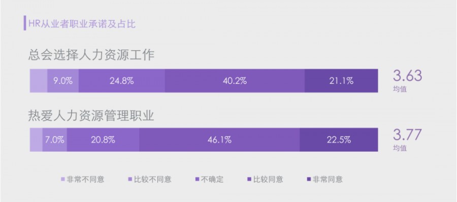 职业承诺:61.3%HR从业者不考虑换职业 此次问卷结果表示,热爱人力资源管理的从业者占比68.6%。 如重做职业选择依旧不会放弃人力资源管理职业的HR从业者占比61.3%。同时,有10.6%和14%的从业者表示不热爱人力资源管理职业以及重做选择时会放弃该职业。