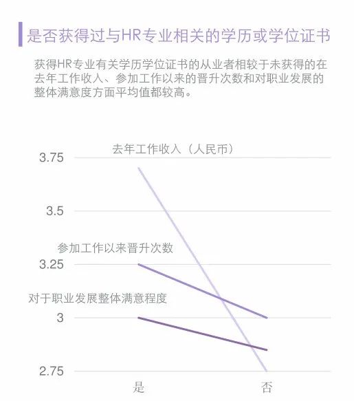 人力资本与职业发展分析 技能证书对比: 获得HR专业有关学历学位证书的从业者相较于未获得的在去年工作收入、参加工作以来的晋升次数和对职业发展的整体满意度方面平均值都较高。