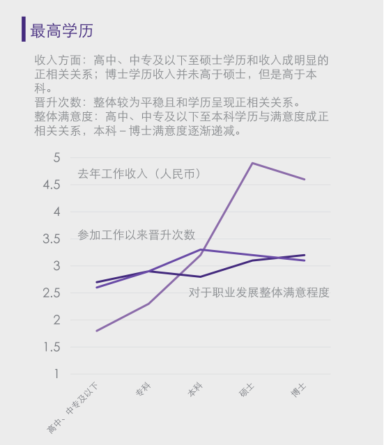 学历对比: 收入方面:高中、中专及以下至硕士学历和收入成明显的正相关关系;博士学历收入并未高于硕士,但是高于本科。 晋升次数:整体较为平稳且和学历呈现正相关关系。整体满意度:高中、中专及以下至本科学历与满意度成正相关关系,本科-博士满意度逐渐递减。