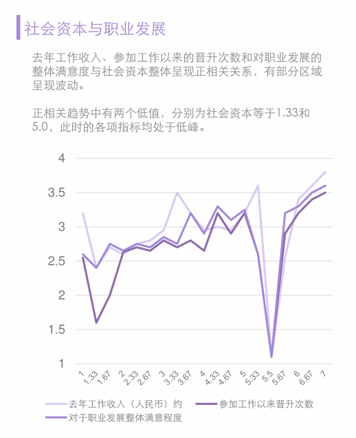 社会资本、心理资本与职业发展分析 社会资本与职业发展: 去年工作收入、参加工作以来的晋升次数和对职业发展的整体满意度与社会资本整体呈现正相关关系,有部分区域呈现波动。 正相关趋势中有两个低值,分别为社会资本等于1.33和5.0,此时的各项指标均处于低峰。